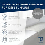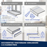Unsere Fensterbank Verkleidung für den Innenbereich kann mit Hilfe von Bauklebern einfach auf die bestehende Fensterbank oder auf das Mauerwerk montiert werden. Die Fensterbank kann sehr leicht mit einer Stichsäge, Handkreissäge oder einer feinen Handsäge angepasst werden. Die mitgelieferten Endkappen/Seitenabschlüsse müssen ebenfalls aufgeklebt werden.